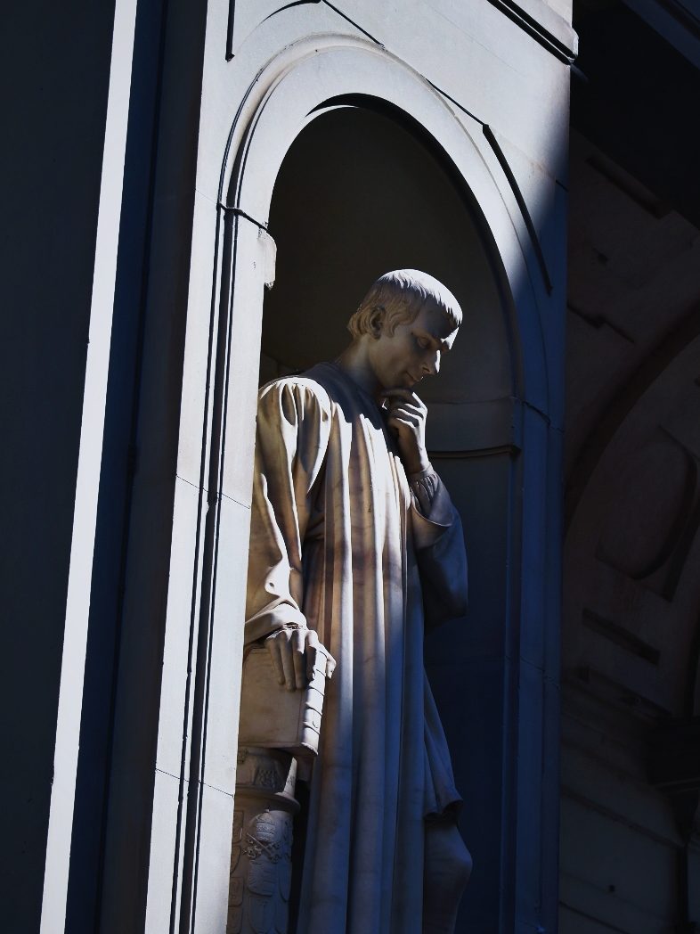 The basilica of Santa Croce is also known as the Pantheon of Florence. This is because the church contains many tombs and funerary monuments of famous Florentines. You’ll find the grave of political leader Niccolò Machiavelli, but also of scientist Galileo Galilei. In addition, a large number of artists and architects are buried here, including Michelangelo and Vasari. Dante has a funerary monument here but he is actually buried in Ravenna where he died in exile.