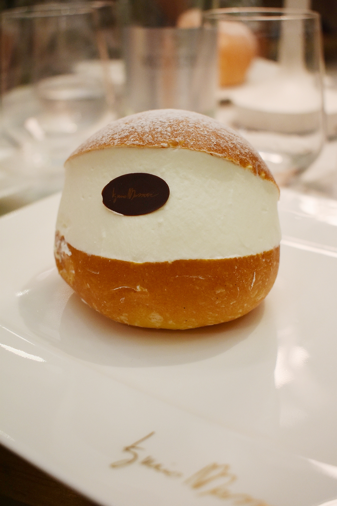 If you’ve never tried it, a Maritozzo is a brioche cut open and filled with whipped cream. Very typical of Rome. Iginio Massari prepares his with whipped cream and crema pasticcera which is custard.